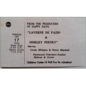 The Ticket is a complimentary ticket issued by Paramount Television Studios in conjuction with the ABC for a show starring Penny Marshall and Cindy Williams and is in excellent condition.